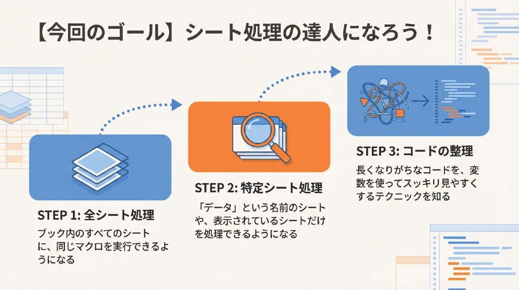今回のテーマは、実務で非常に重要な「複数のシートを扱う処理」と「条件分岐」です。月別の売上シートや支店ごとのデータシートなど、同じ形式のシートが複数ある場合に、それらを一括で処理する方法を学びます。
