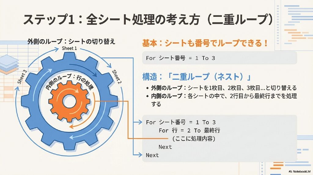 この構造により、VBAはまず外側のループで1枚目のシートを選択し、次に内側のループを最後まで実行してそのシートの全行を処理します。それが終わってから初めて、外側のループが2枚目のシートに進み、再び内側のループで全行を処理する…という流れを、最後のシートまで自動で繰り返してくれるのです。