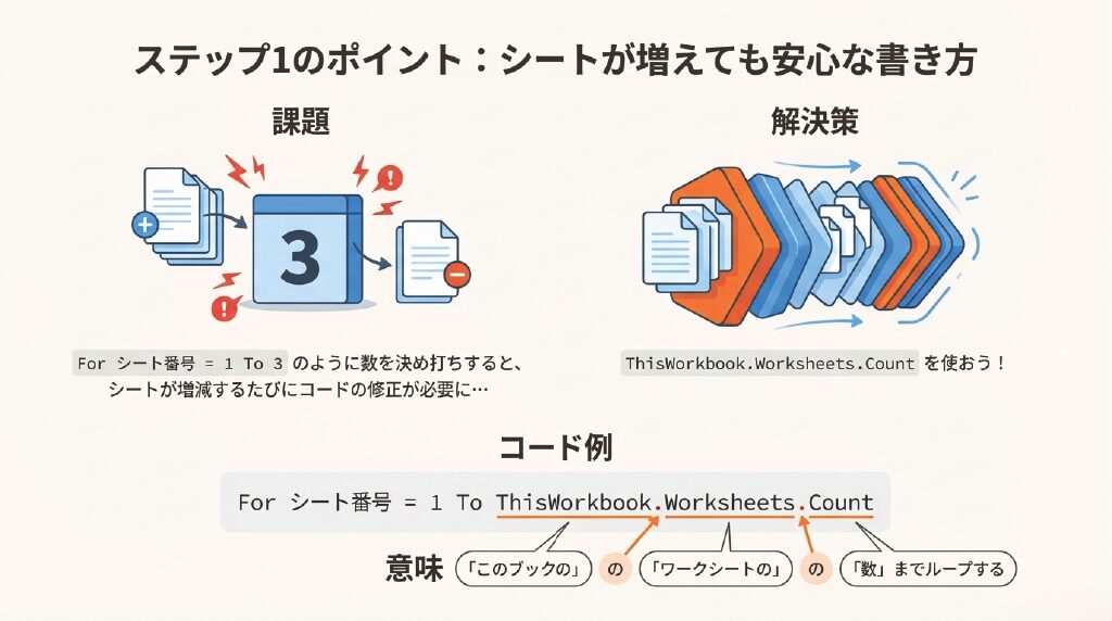 シートの枚数をFor シート番号 = 1 To 3のように固定で書いてしまうと、シートが増えたり減ったりするたびにコードを修正する必要があり、非常に不便です。