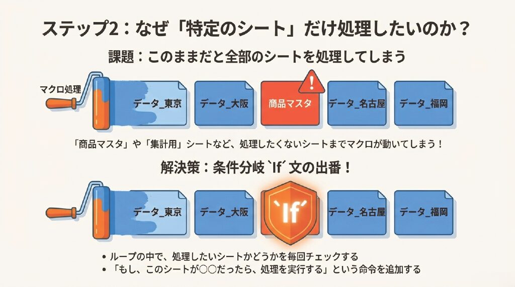 全シートをループ処理する方法は便利ですが、実務では「商品マスタ」シートや集計用のシートなど、処理の対象外としたいシートが含まれていることがほとんどです。