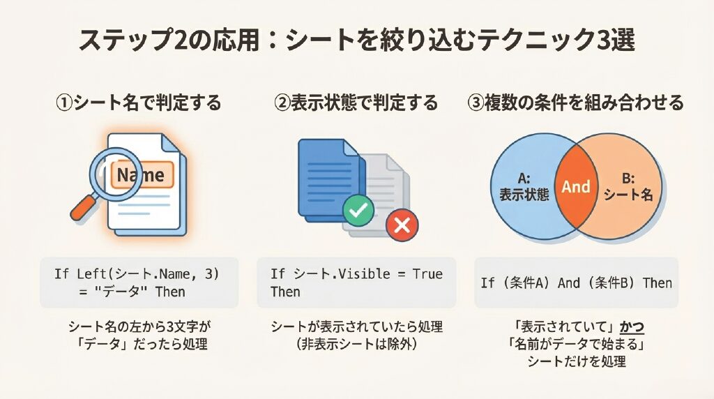 .Nameや.Visibleプロパティを使って、特定のシートだけを処理対象にする。And演算子で複数の条件を組み合わせる。 - Setステートメント: シートオブジェクトを変数に入れ、コードを読みやすく、書きやすくする。