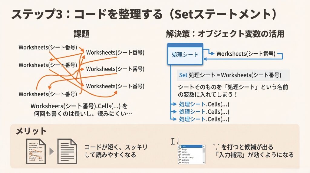 この課題を解決するのがSetステートメントです。 Set 処理シート = Worksheets(シート番号) このように書くことで、Worksheets(シート番号)というシートオブジェクトそのものを「処理シート」という名前の変数に格納できます。