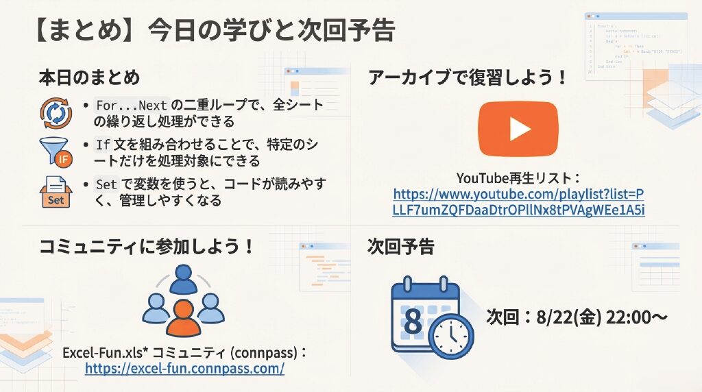 この記事では、複数のシートを効率的に扱うためのVBAテクニックを学びました。
