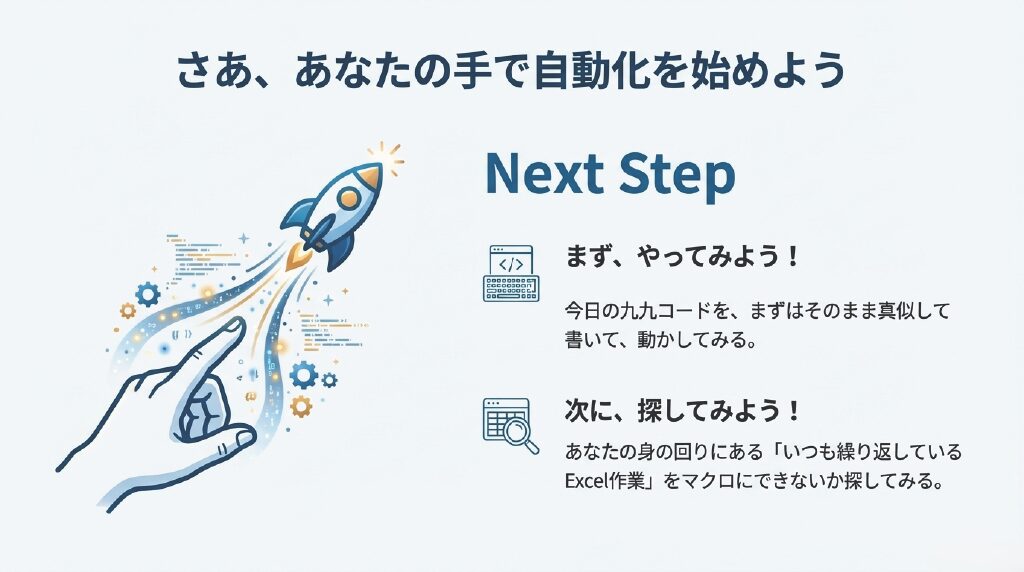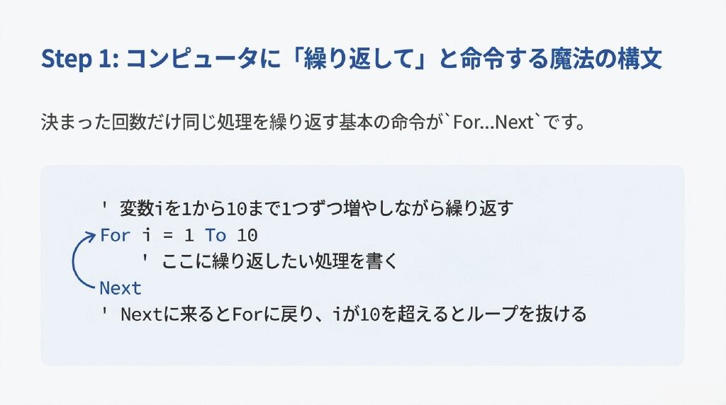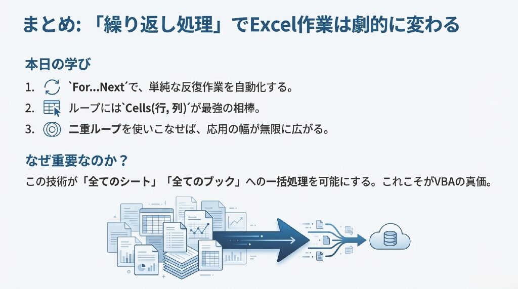 • 繰り返し処理の基本: For...Next文を使うことで、同じような処理を何度も自動で実行できることを学びました。