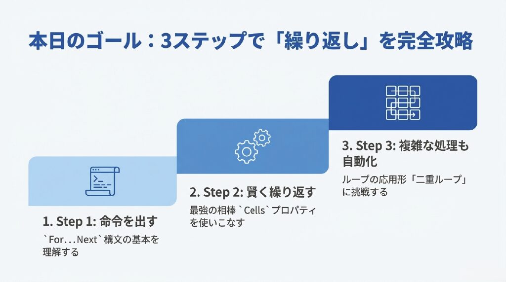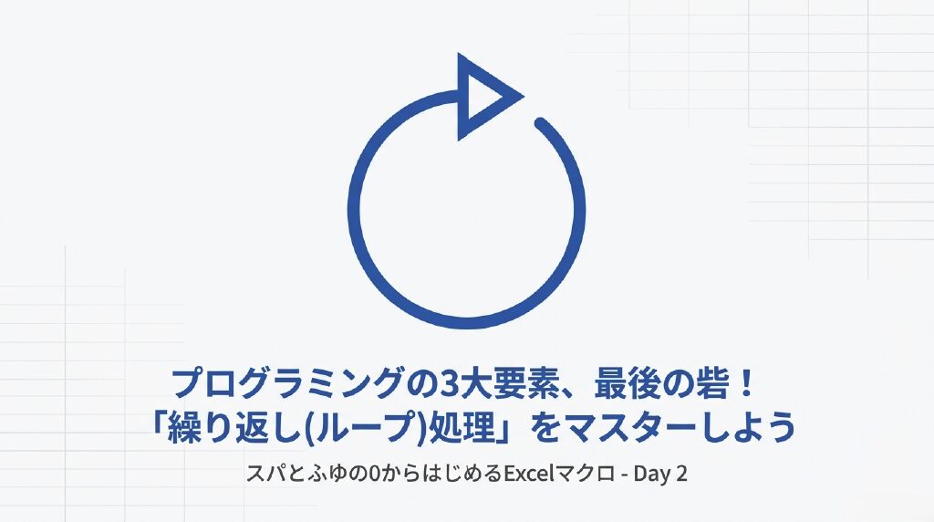 さて、この日のテーマは、プログラミング3大要素(変数・分岐・繰り返し)の最後の一つ、「繰り返し処理(ループ)」です。これこそが、Excel VBAの真価を発揮するための最強の武器!この機能をマスターすれば、これまで手作業でやっていた退屈な作業を一瞬で終わらせることができるようになります。考えるだけでワクワクしますね!