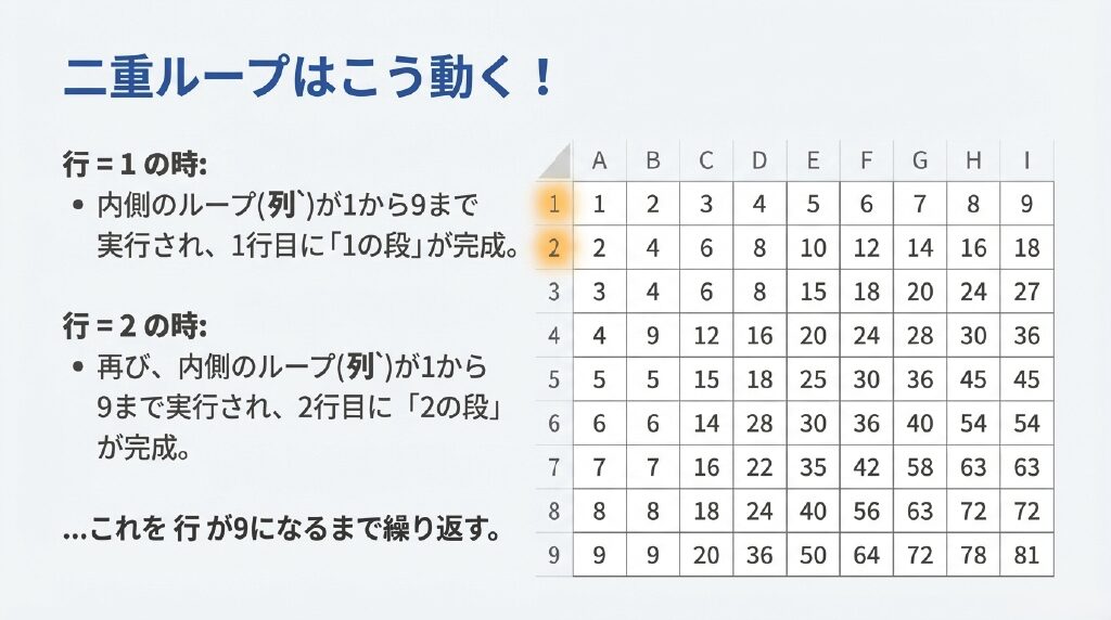 このコードの動きは少し複雑ですが、講師は「外側のループ(行)が1の時、内側のループ(列)が1から9まで一気に回る。それが終わると、外側のループの行が2になり、また内側のループが1から9まで回る」と解説してくれました。