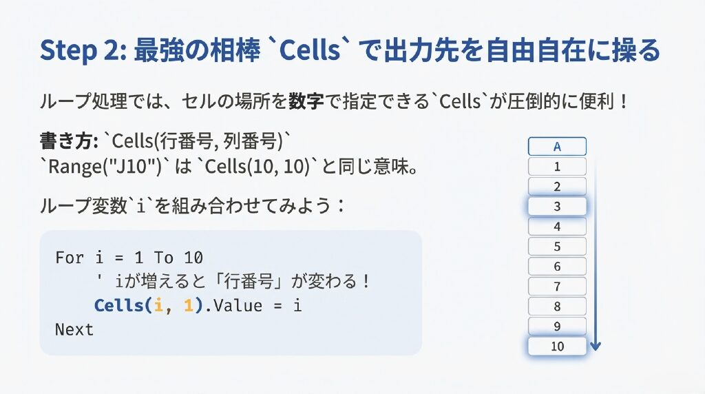 • Cellsプロパティの有用性: ループ処理ではCells(行, 列)を使うと、縦方向・横方向どちらの繰り返し処理もシンプルに書けて非常に便利です。