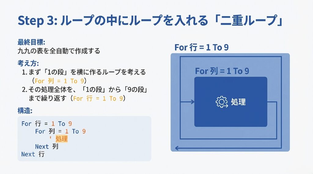 • 二重ループの概念: ループを組み合わせる(入れ子にする)ことで、九九の表のような二次元のデータも効率的に扱えるようになります。